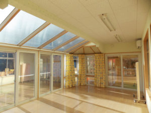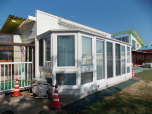 幅が6mものサンルームの短形屋根の部分は、電動オーニングを取り付け、両側の異形(三角形)部分と既存建物側は断熱仕様としました。窓部分にも遮熱タイプのフィルムを張りました。