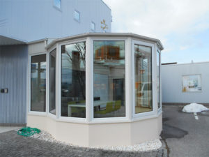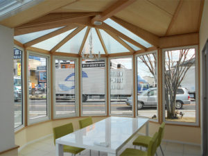 滋賀県彦根市の商社様から、訊ねてこられたお客様がくつろいてお話いただけるようにとのお考えで、悠Uサンルームを選んでいただきました。