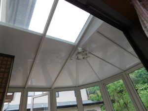 悠Uサンルームの基準屋根仕様は強化ガラス(厚さ5mm)とツインカーボヒートカット(厚さ10mm)ですが、屋根の一部を遮熱・断熱仕様にすることができます。