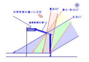 冬は大きな窓から斜めの角度(30°~)で日が射し明るく暖かい。夏は屋根の多くが遮熱仕様としてあることで、角度的(~80°)に灼熱の太陽熱は避けられるということになります。