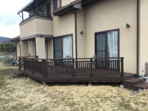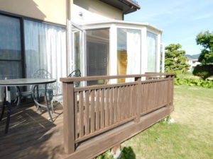 既存のウッドデッキを一部(写真手前右側の部分)取り壊し切断してサンルームを設置しました。