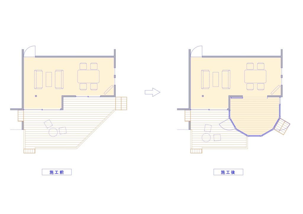 そこで、既存の部屋とサンルームとの接続部に取り付ける間仕切りのサッシを引き込み型にして開口部を広くしました。そうすることで既存の部屋とサンルームが一体化し、ゆとりある空間となりました。また、サンルームとウッドデッキの間にドアを設け、楽しい生活動線を生み出すご提案をさせていただきました。