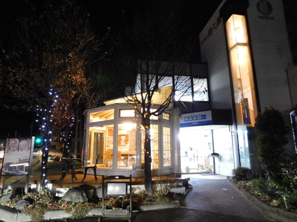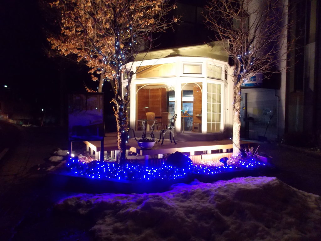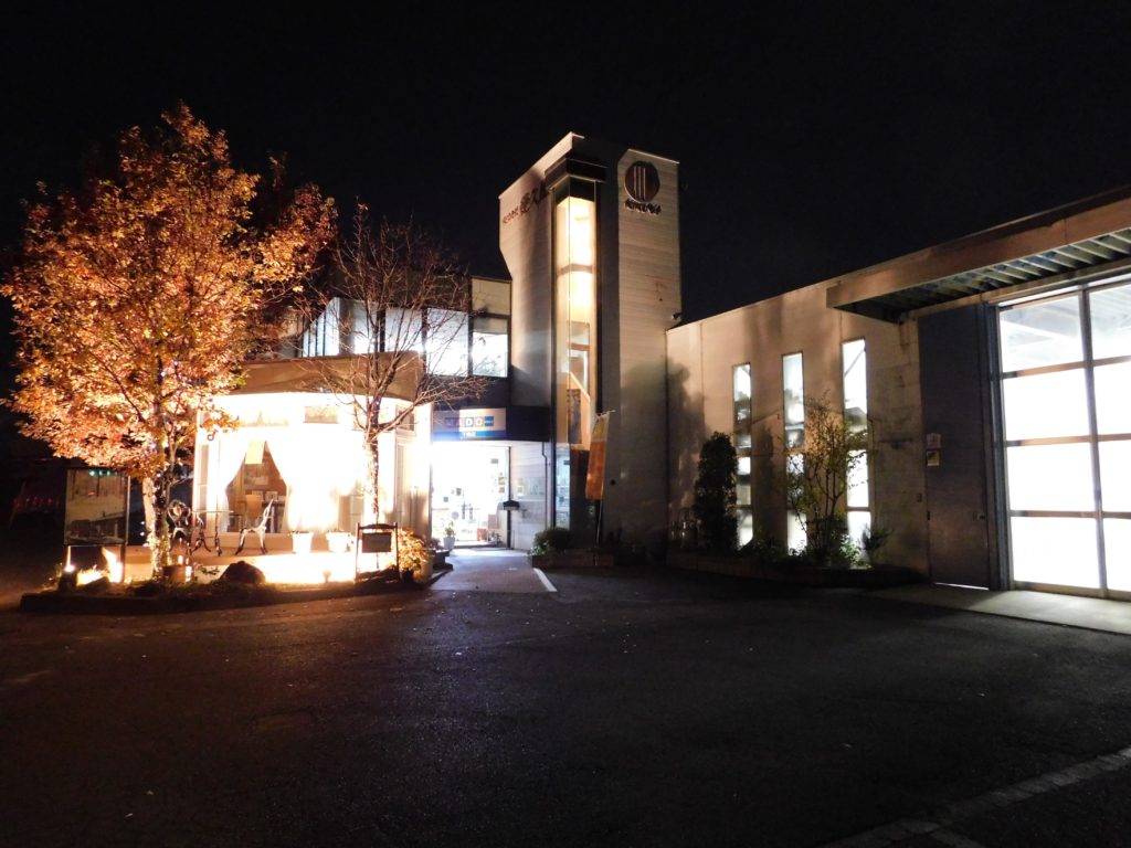 弊社の事務所入り口と悠Uサンルーム展示場。夜の景色です。