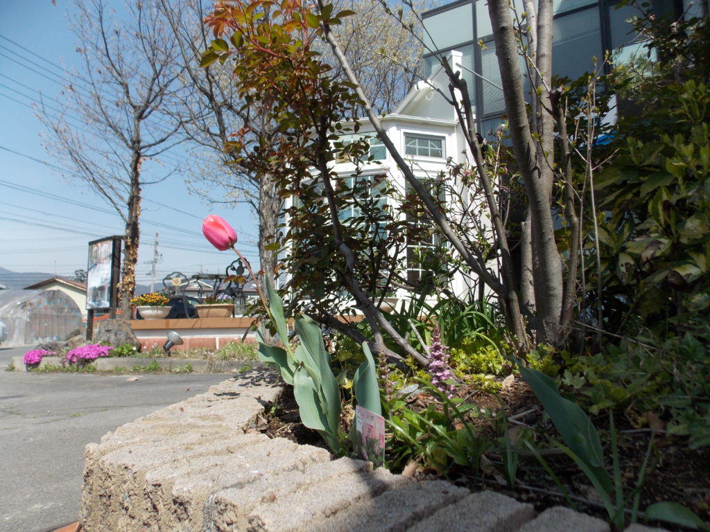 4月中旬、花壇のチューリップの花一輪。