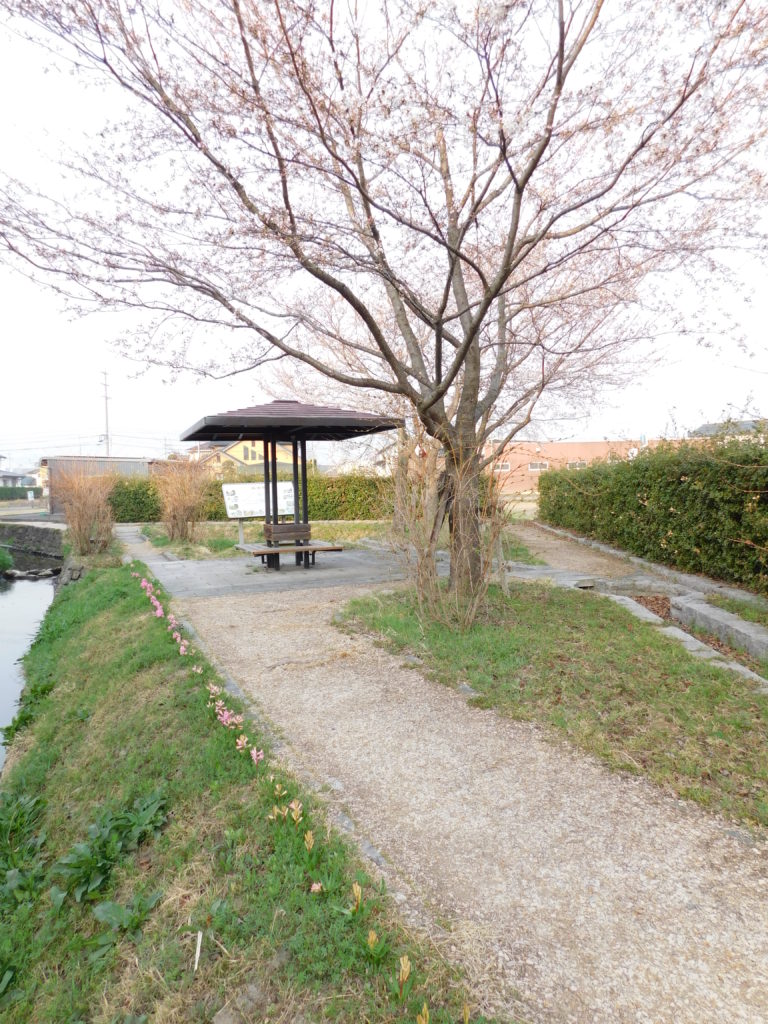 4月初旬、桜が満開。小川の水に写り美しい。