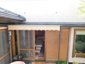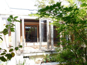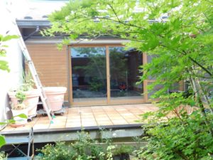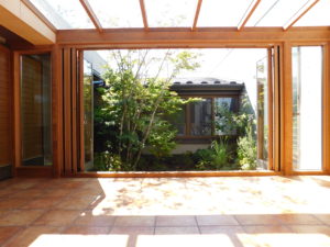 ②既存タイル床上にテラス屋根とフルオープンサッシを取り付けました。